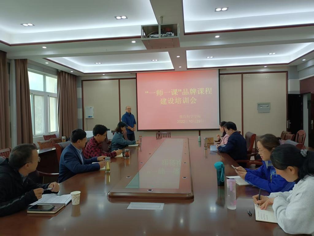 时间:2022-10-31 17:36:45 来源: 作者: 阅读: 次为落实信阳师范学院“一院一品”工作要求,进一步推动我院“一师一课”品牌课程建设,积极开展课堂教学改革,推动信息技术在课堂教学中的有效应用和深度融合,我院遴选了首批“一师一课”品牌课程10门,并于2022年10月29日在教科楼402会议室举行“一师一课”品牌课程建设培训会,院党委书记房加帅,副院长郭勇、孙天义,专任课教师刘琦、郑雪松、杨建朝、邢思珍、刘萱、马金焕、汪媛媛参加了培训会。培训会由副院长郭勇主持,刘琦老师主讲。
