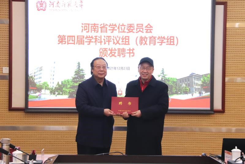 会上,河南师范大学党委书记、教育学科评议组召集人赵国祥教授为我院院长何安明教授、张茂林教授等专家组成员颁发聘书。