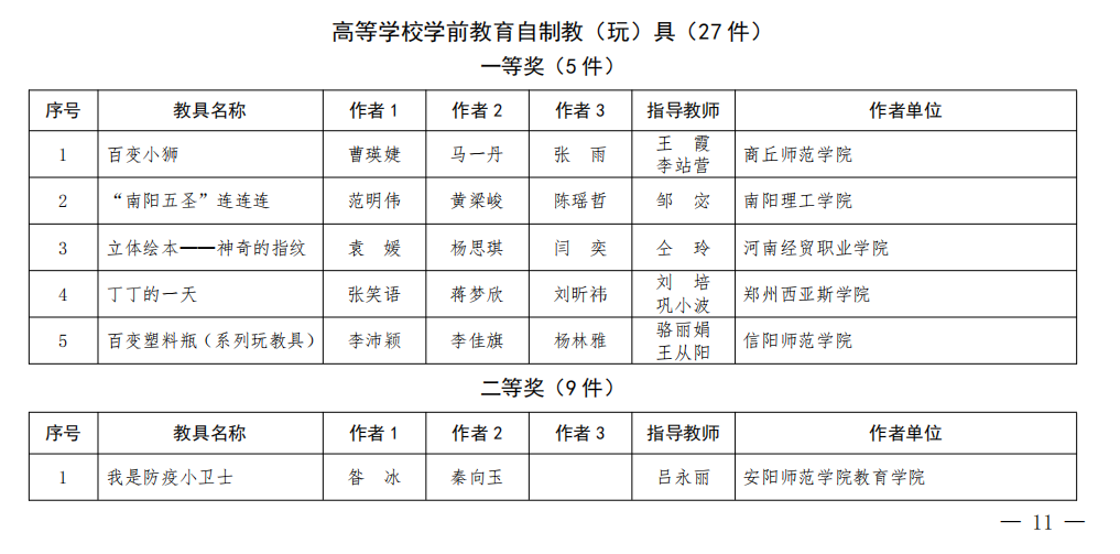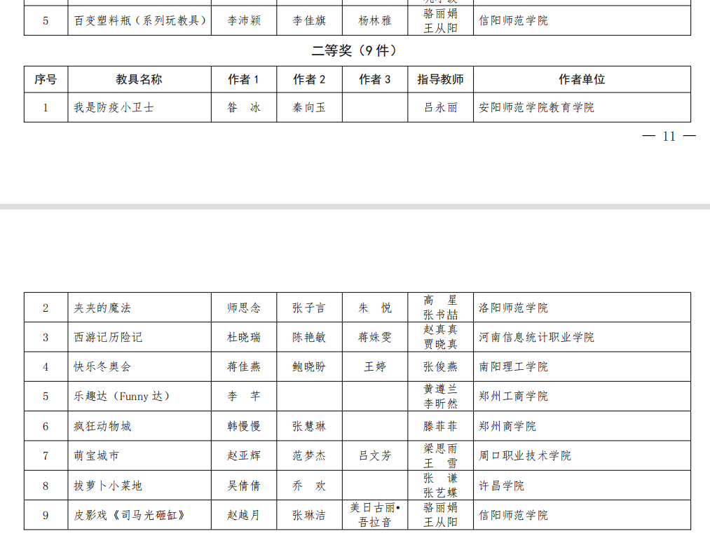 时间:2022-09-28 17:39:24 来源: 作者: 阅读: 次近日,河南省教育厅公布了第十九届河南省中小学幼儿园自制教(玩)具暨学生科技创新小制作小发明评选活动获奖名单,我院首次参赛的2件作品均获佳绩。其中,2020级学前教育本科2班李沛颖、李佳旗、杨林雅的作品《百变塑料瓶(系列玩教具)》(指导教师:骆丽娟、王从阳)获高等学校学前教育自制教(玩)具组一等奖,2020级学前教育本科1班赵越月、张琳洁、美日古丽•吾拉音的作品《皮影戏<司马光砸缸>》(指导教师:骆丽娟、王从阳)获二等奖。