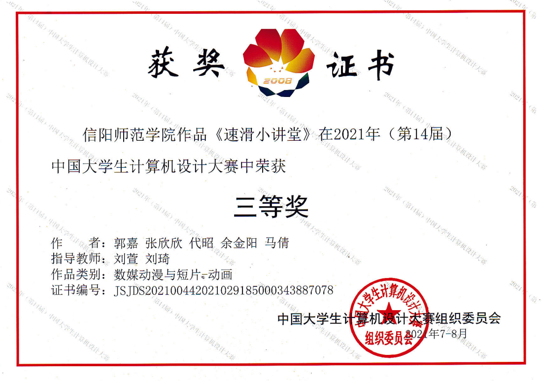 时间:2021-10-05 18:20:28 来源: 作者: 阅读: 次近日,由国家教育部主办的2021年第十四届中国大学生计算机设计大赛落下帷幕,在厦门决赛赛区数媒动漫与短片普通组比赛中,我院两组作品经过河南省大赛推选,与全国上百所高校参赛作品进行角逐,最终脱颖而出,均荣获国家级三等奖。获奖作品是由我院教育技术系老师武滨指导,王艺婷、马元春、刘嘉欣和程书雅完成的动画作品《震惊!原来这才是冬奥会。你知道吗?》,刘萱、刘琦老师指导,郭嘉、张欣欣、代昭、余金阳和马倩完成的动画作品《速滑小讲堂》。