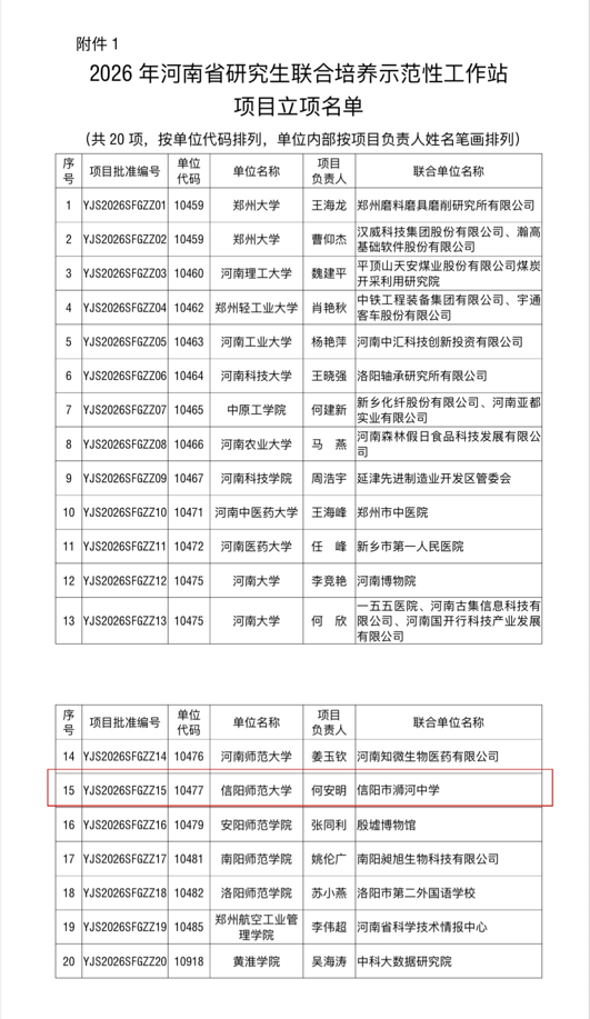 我院何安明教授获批2026 年河南省研究生联合培养示范性工作站