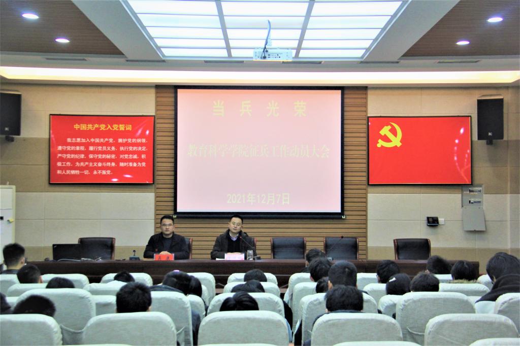 时间:2021-12-07 21:40:28 来源:教科院新闻部 作者:马玉娇 亓亚兴 刘至涵 阅读: 次为加强征兵政策宣传,保证征兵入伍工作顺利开展,12月7日,williamhill威廉希尔征兵工作动员大会在教科楼301会议室顺利召开。院党委副书记董银银,武装干事吴康以及2019级、2020级、2021级全体有应征意向的学生参加此次动员大会。会议由吴康主持。