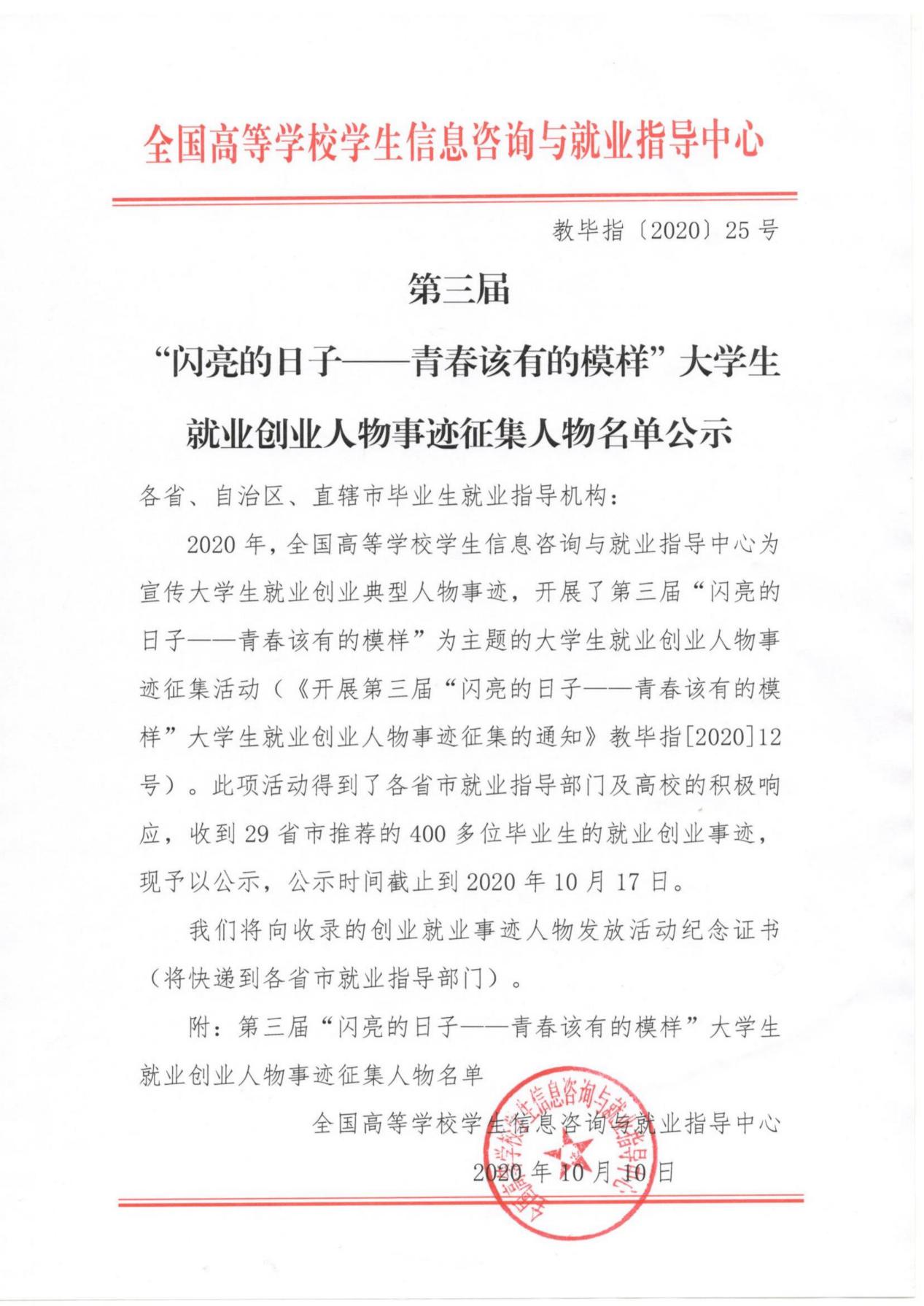 为响应习近平总书记和李克强总理鼓励大学生基层就业和创新创业的号召,加强高校毕业生就业创业宣传,教育部全国高等学校学生信息咨询与就业指导中心主办“闪亮的日子——青春该有的模样”大学生就业创业人物事迹征集活动,旨在加强高校毕业生就业创业宣传,树立就业创业典型,展示大学生就业创业的丰硕成果和精神风貌,号召青年学生扎根祖国大地,在创新创业中增长才干、锤炼意志,在实现伟大复兴中国梦的实践中实现青春梦想。本次评选活动从6月份开始,经过学校评选报送、省教育厅评审、教育部终审评选三个阶段,最终选出全国先进典型。