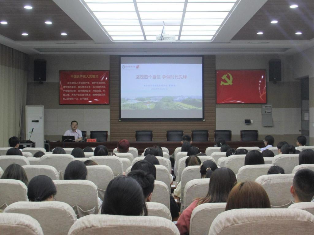 开班仪式后,董银银以《坚定四个自信,争做时代先锋》为题讲授培训第一课。他从深刻认识中国特色社会主义道路来之不易,切实增强道路自信;深刻理解中国特色社会主义理论的科学性,切实增强理论自信;深刻把握中国特色社会主义制度的优越性,切实增强制度自信;深刻领会中国特色社会主义文化的生命力,切实增强文化自信等四个方面由浅入深的诠释了什么是“四个自信”以及为什么要秉承“四个自信”和如何践行“四个自信”等,引导广大青年学生坚定“四个自信”,争做时代先锋。